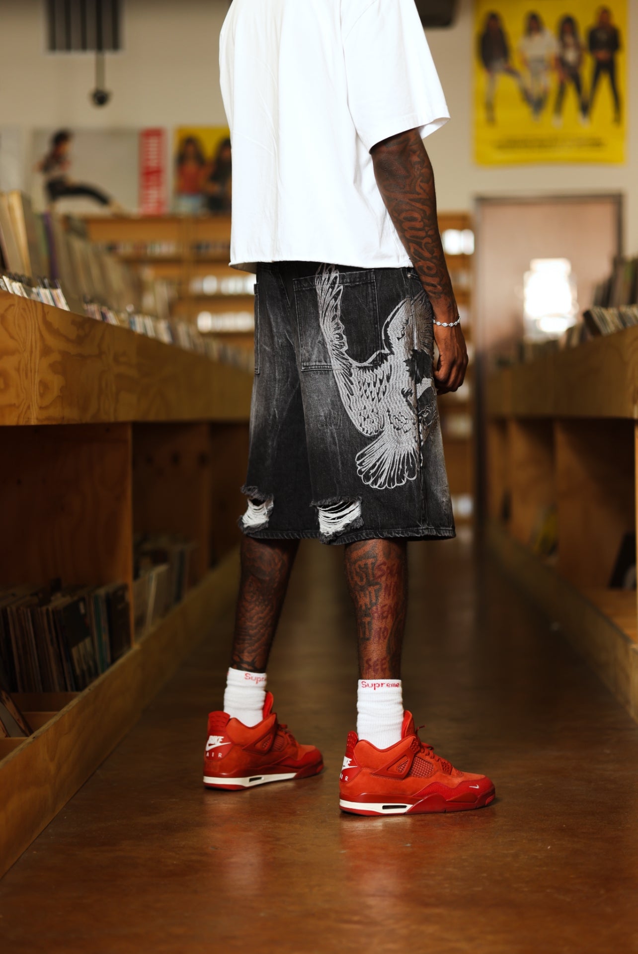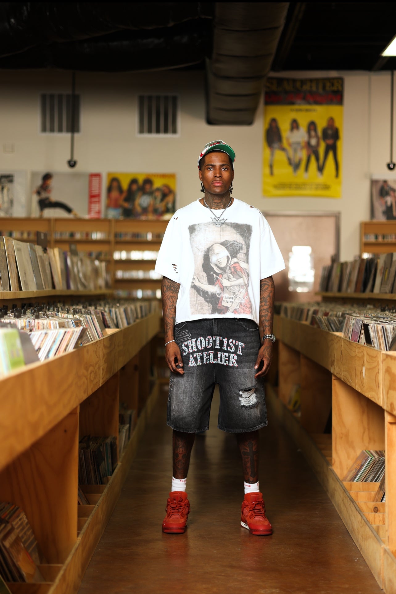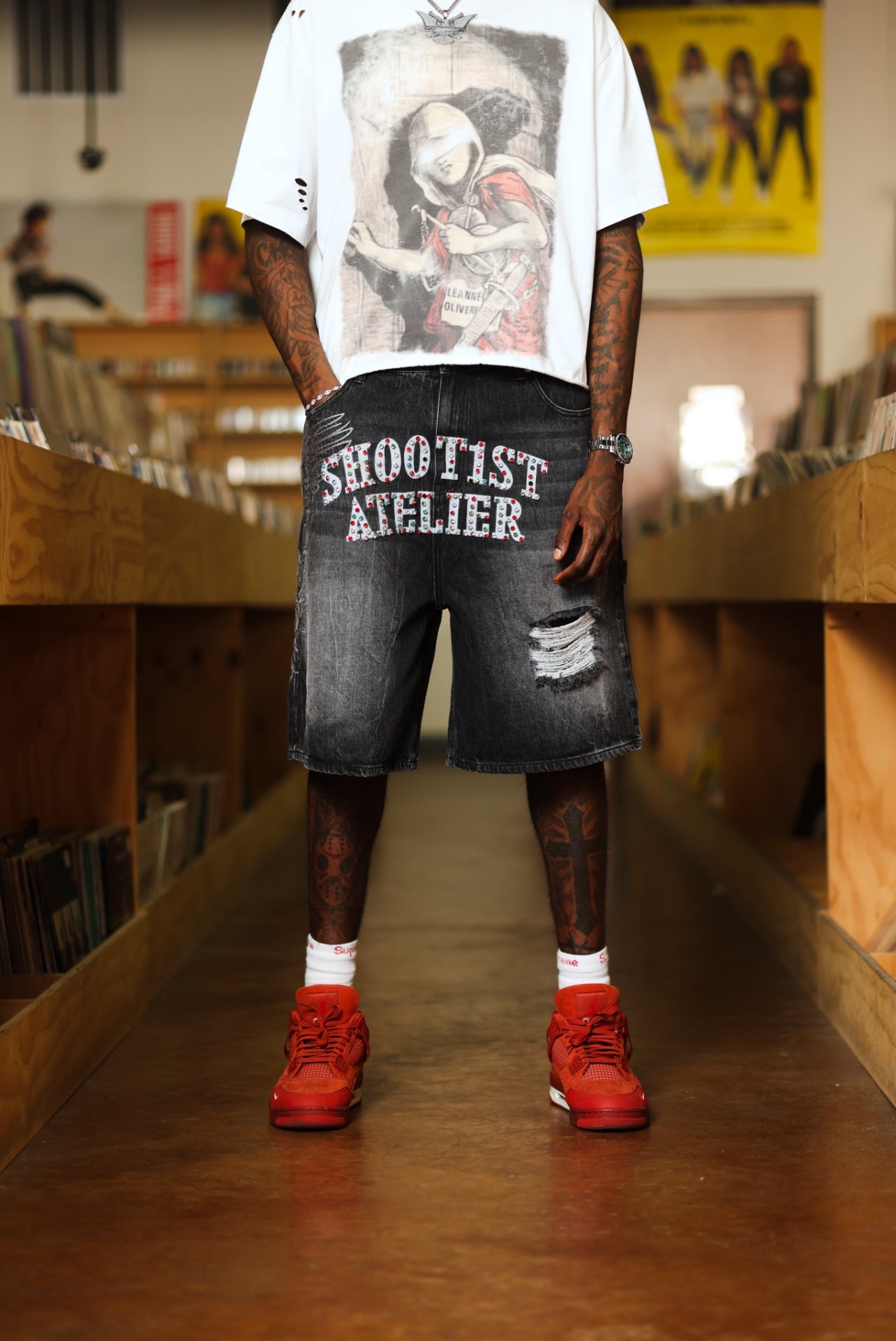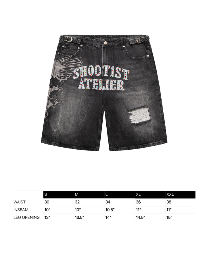 “Shoot1st Atelier” laser print across crotch with hand-placed stones